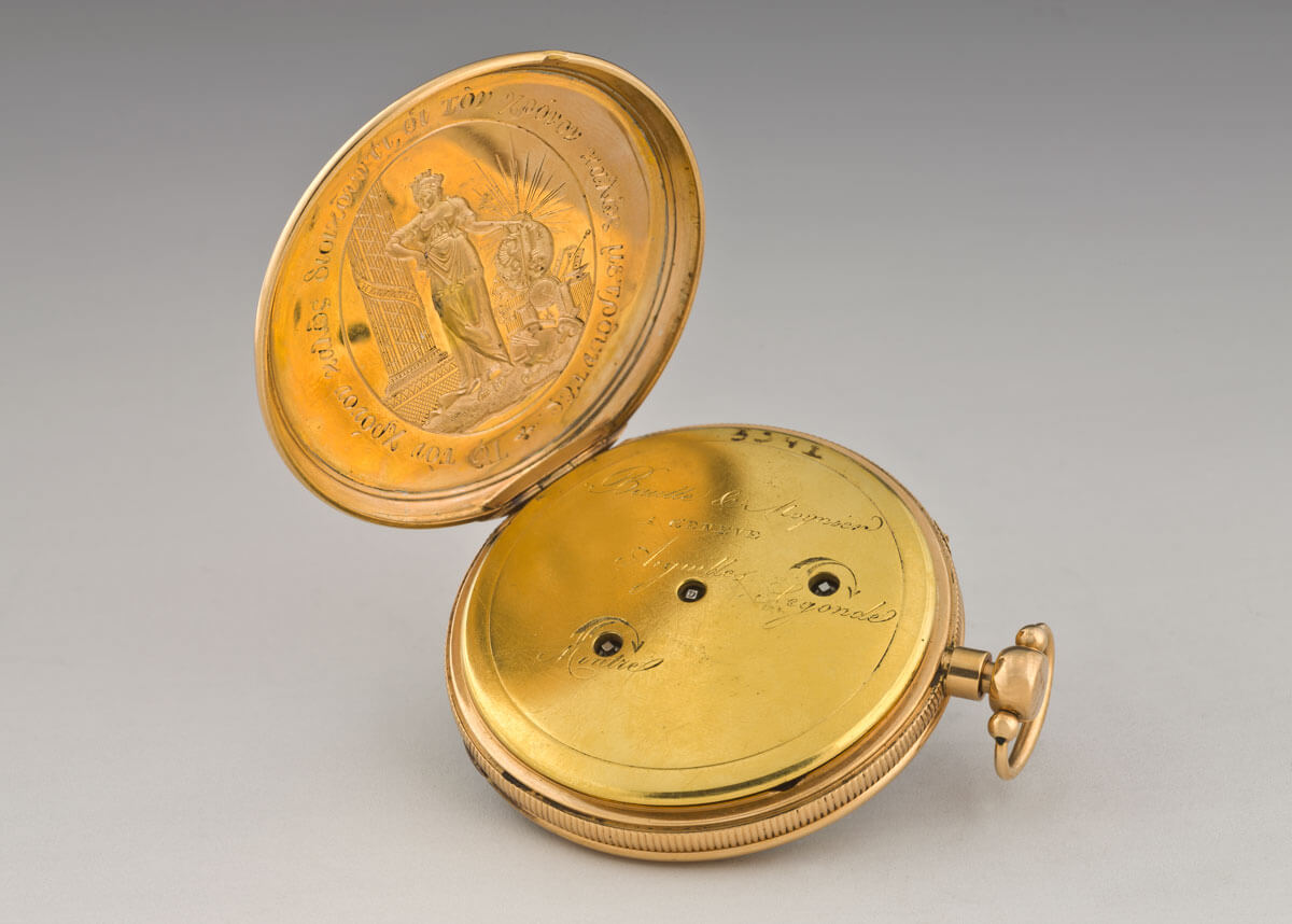 Το 1814, ο Ιωάννης Καποδίστριας μετέβη, ως μέλος της ρωσικής αντιπροσωπείας, στο Συνέδριο της Βιέννης, όπου, μεταξύ άλλων, τάχθηκε υπέρ της ανεξαρτησίας της Ελβετίας. Σε ένδειξη ευγνωμοσύνης, οι εκπρόσωποι της πόλης της Γενεύης χάρισαν στον Έλληνα διπλωμάτη, τον οποίον είχαν ανακηρύξει και επίτιμο πολίτη, πολυτελές, χρυσό ρολόι του οίκου Bautte et Moynier à Genève. Το ρολόι είναι μοναδικό λόγω της εγχάρακτης παράστασης που φέρει στην εσωτερική πλευρά της κάσας του. Εντός κυκλικού μεταλλίου εικονίζεται η εστεμμένη Ελβετία, με μορφή αρχαιοπρεπώς ντυμένης γυναίκας, η οποία κρατά τον θυρεό της πόλης της Γενεύης. Δίπλα της, στο έδαφος, βρίσκονται σκορπισμένα αντικείμενα που σχετίζονται με τον χώρο του μυστικού εταιρισμού (σφύρα, άβακας, διαβήτης, στάθμη κ.ά.). Εικονίζονται ακόμη δύο στήλες, οι οποίες, δημιουργώντας διάδρομο, οδηγούν σε υπερυψωμένο ρολόι. Η παράσταση περιβάλλεται από τη επιγραφή Τῶ τόν χρόνον καλῶς διοικοῦντι οἱ τόν χρόνον καλῶς μετροῦντες, συμβολική και παιγνιώδης αναφορά στην επιδεξιότητα του Καποδίστρια στην άσκηση πολιτικής και την ξακουσμένη ικανότητα των Γενευαίων στην κατασκευή ρολογιών.