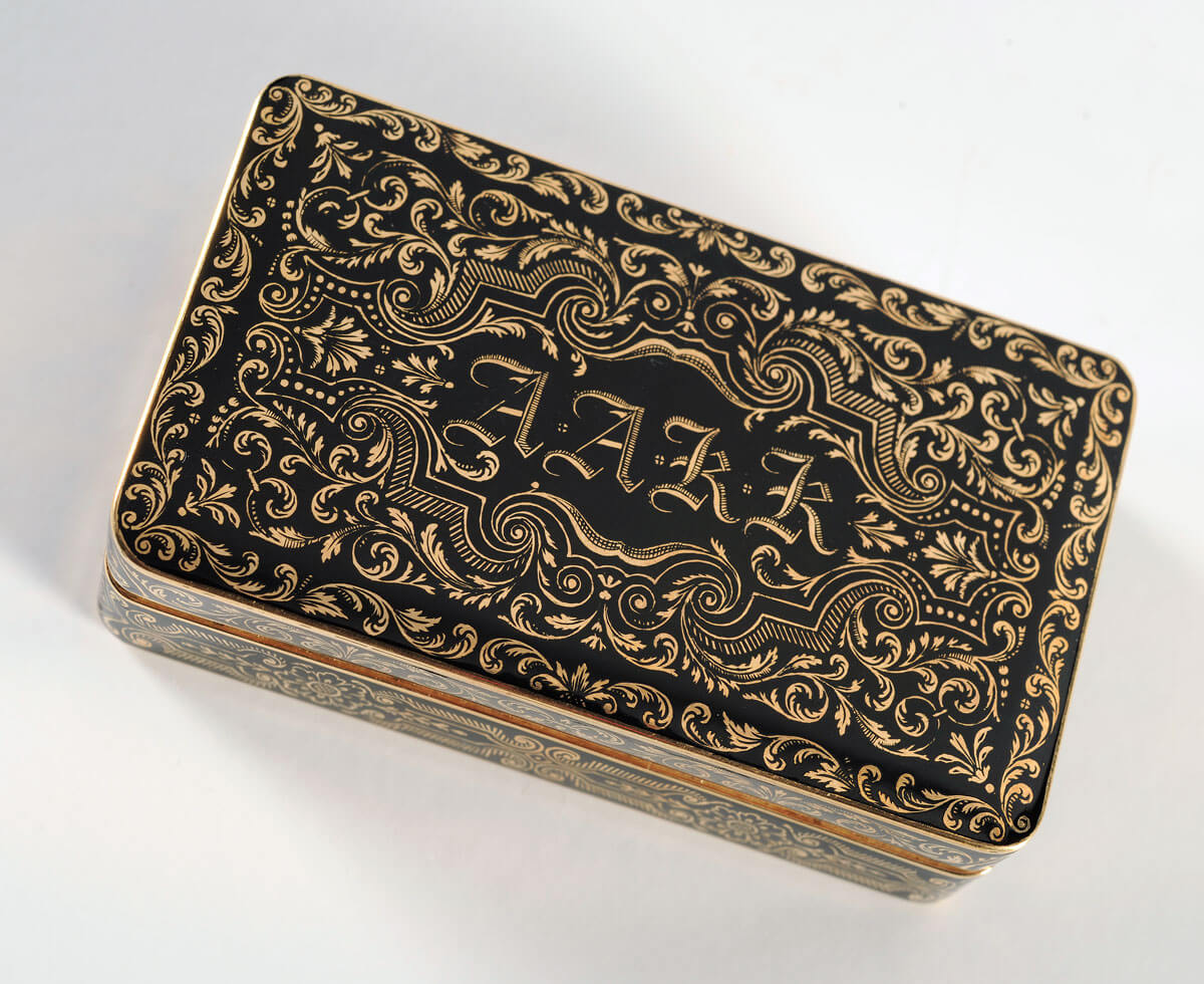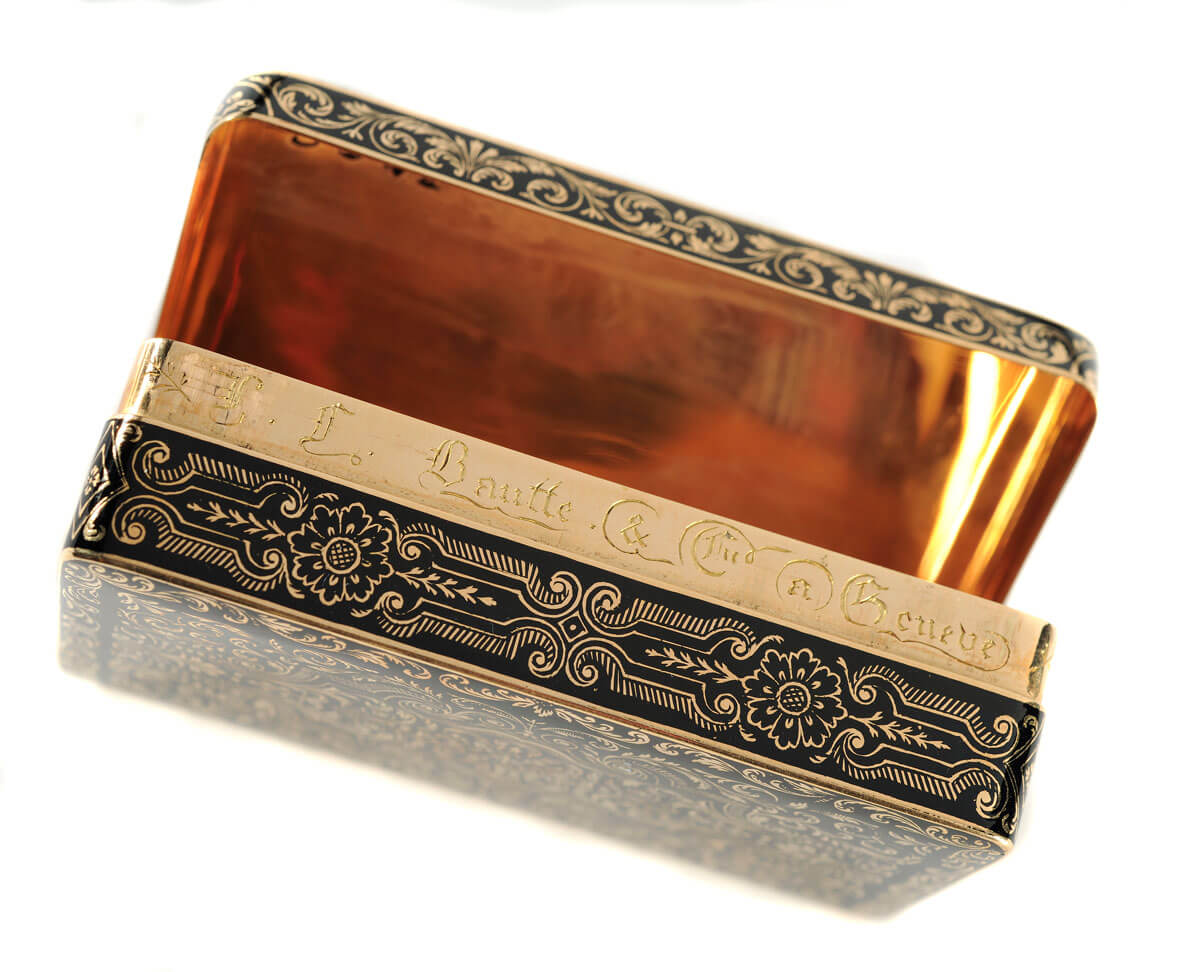Έργο του διάσημου Ελβετού ωρολογοποιού και κοσμηματοποιού Jean-François Bautte (1772-1837), η ταμπακοθήκη του Ιωάννη Καποδίστρια φέρει χρυσό, εγχάρακτο σε μαύρο σμάλτο, φυτικό και ανθικό διάκοσμο, καθώς και τα αρχικά «Α·Α·Κ·Κ». Η έρευνα δεν έχει αποφανθεί με βεβαιότητα για τη σημασία των γραμμάτων αυτών, αν και εικάζεται ότι σχετίζονται με τον τίτλο που έλαβε ο Καποδίστριας κατά την Εθνοσυνέλευση της Τροιζήνας και έτσι ερμηνεύονται ως «Ανώτατος Αιρετός Άρχων Κόμης Καποδίστριας».