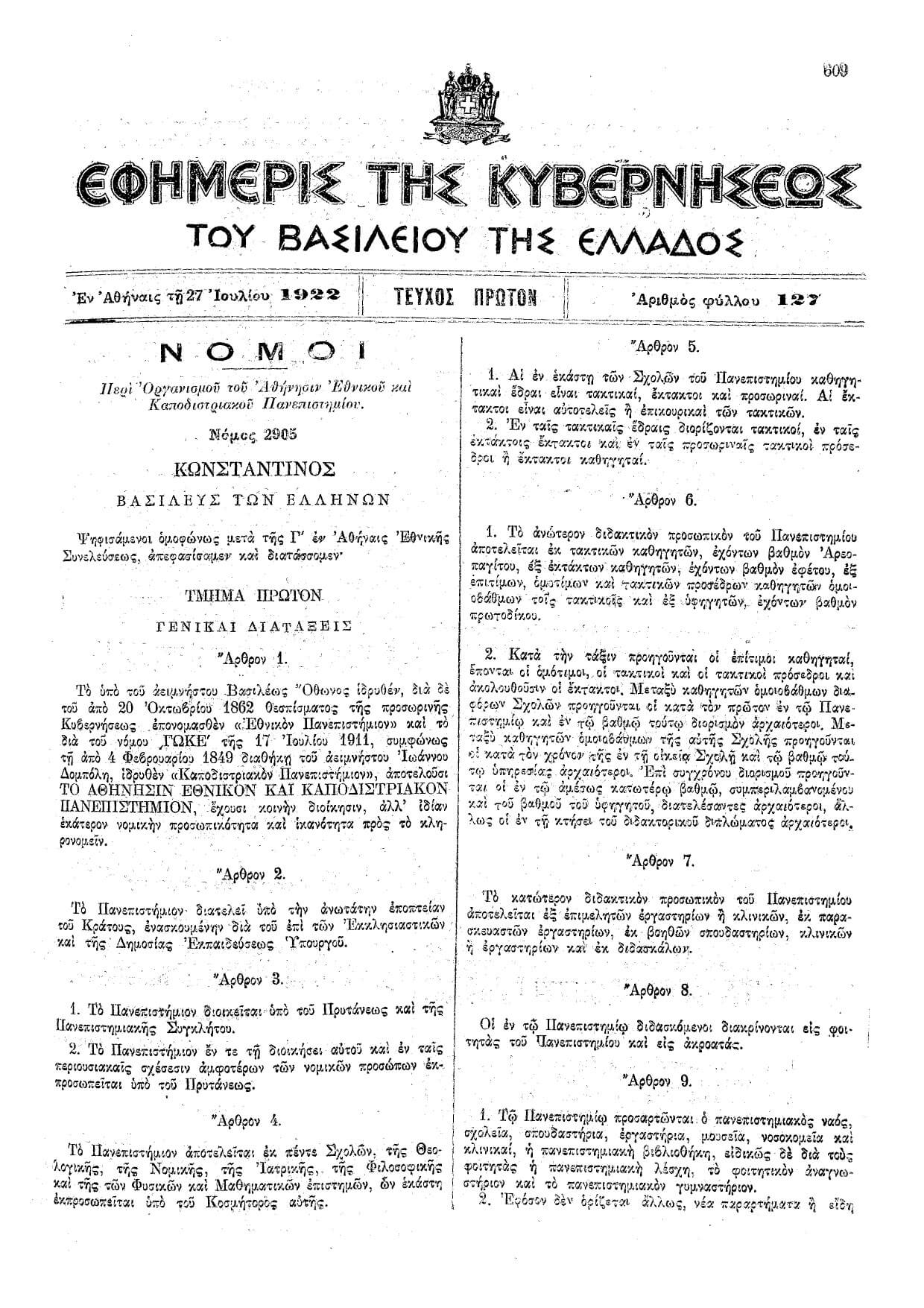 Σύμφωνα με τον νόμο υπ’ αριθμόν 2905, Περὶ Ὀργανισμοῦ τοῦ Ἀθήνησιν Ἐθνικοῦ καὶ Καποδιστριακοῦ Πανεπιστημίου, της 27ης Ιουλίου 1922, που δημοσιεύθηκε στην Εφημερίδα της Κυβερνήσεως του Βασιλείου της Ελλάδος, τα δύο ανώτατα εκπαιδευτικά ιδρύματα της χώρας, το Εθνικόν και το Καποδιστριακόν Πανεπιστήμιον, ενώθηκαν σε έναν ενιαίο θεσμό, με την ονομασία Αθήνησιν Εθνικόν και Καποδιστριακόν Πανεπιστήμιον.