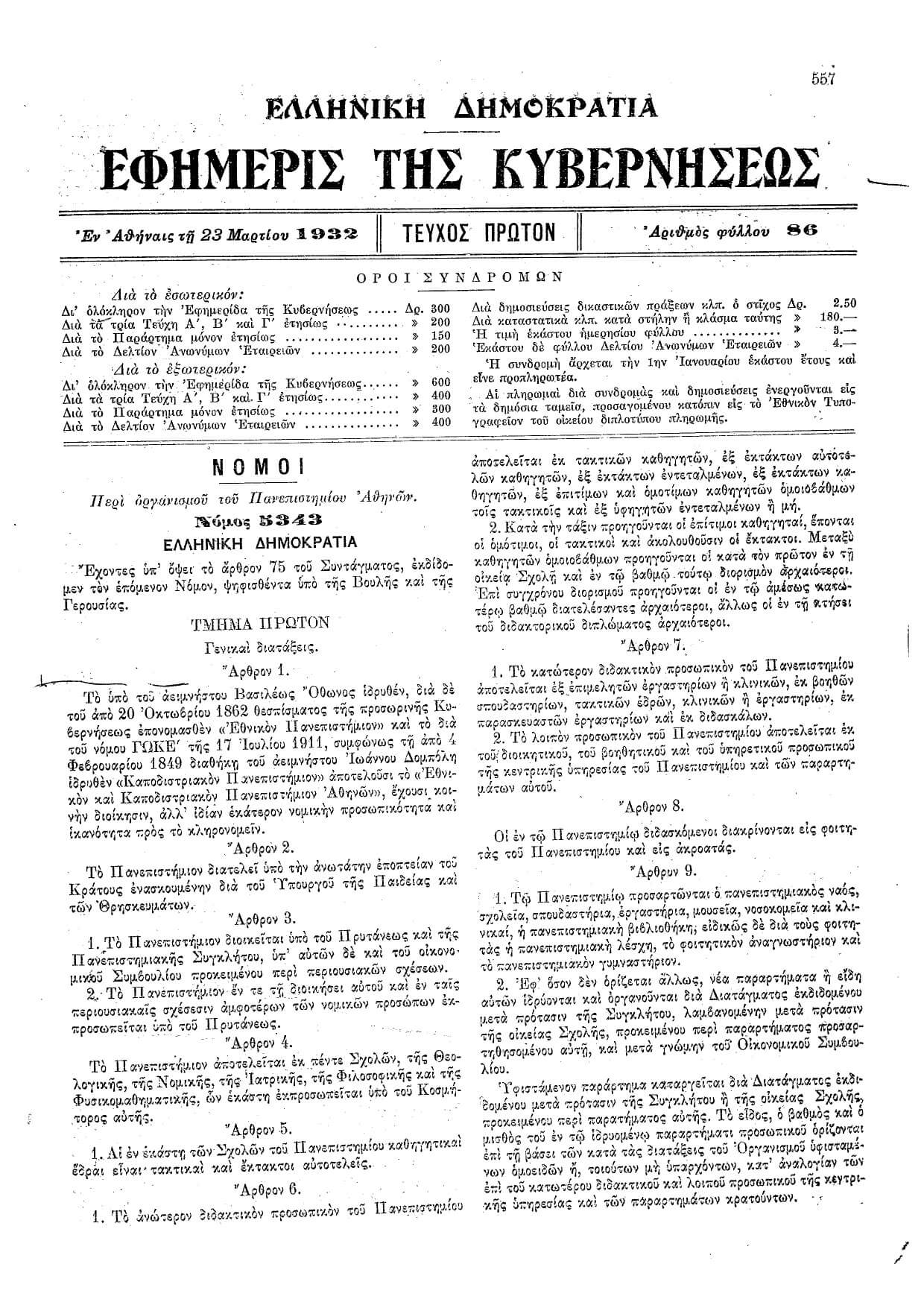 Σύμφωνα με τον νόμο υπ’ αριθμόν 5343, Περὶ ὀργανισμοῦ τοῦ Πανεπιστημίου Ἀθηνῶν, της 23ης Μαρτίου 1932, που δημοσιεύθηκε στην Εφημερίδα της Κυβερνήσεως της Ελληνικής Δημοκρατίας, επισφραγίστηκε η ενοποίηση των δύο ανώτατων εκπαιδευτικών ιδρυμάτων, τα οποία πλέον θα συνέχιζαν να λειτουργούν υπό την κοινή επωνυμία Εθνικόν και Καποδιστριακόν Πανεπιστήμιον Αθηνών.