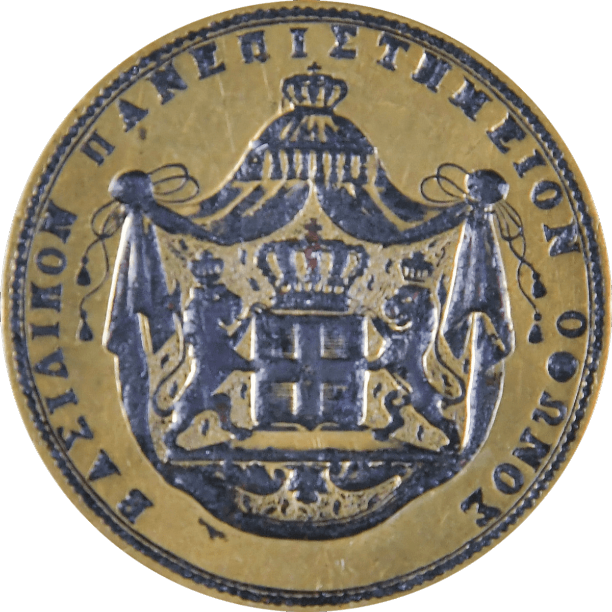 Η πρώτη σφραγίδα, με τους δύο εστεμμένους λέοντες να κρατούν τον θυρεό της Ελληνικής Μοναρχίας, είναι αυτή του Οθωνείου Πανεπιστημίου και χρησιμοποιήθηκε από την ίδρυσή του, το 1837, έως την έξωση του βασιλιά Όθωνα και τη μετονομασία του ιδρύματος σε Εθνικόν, το 1862.