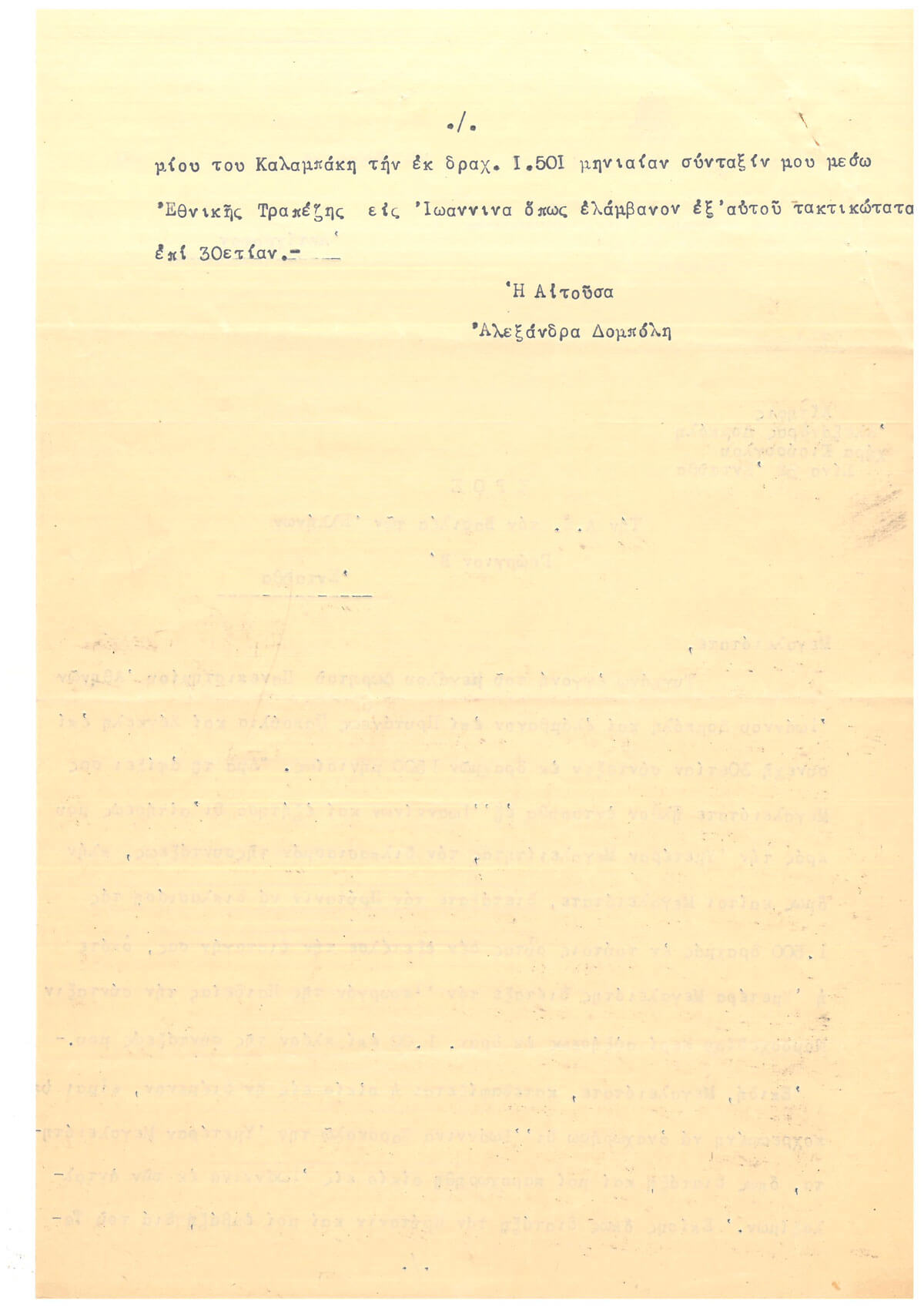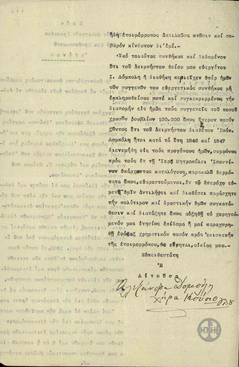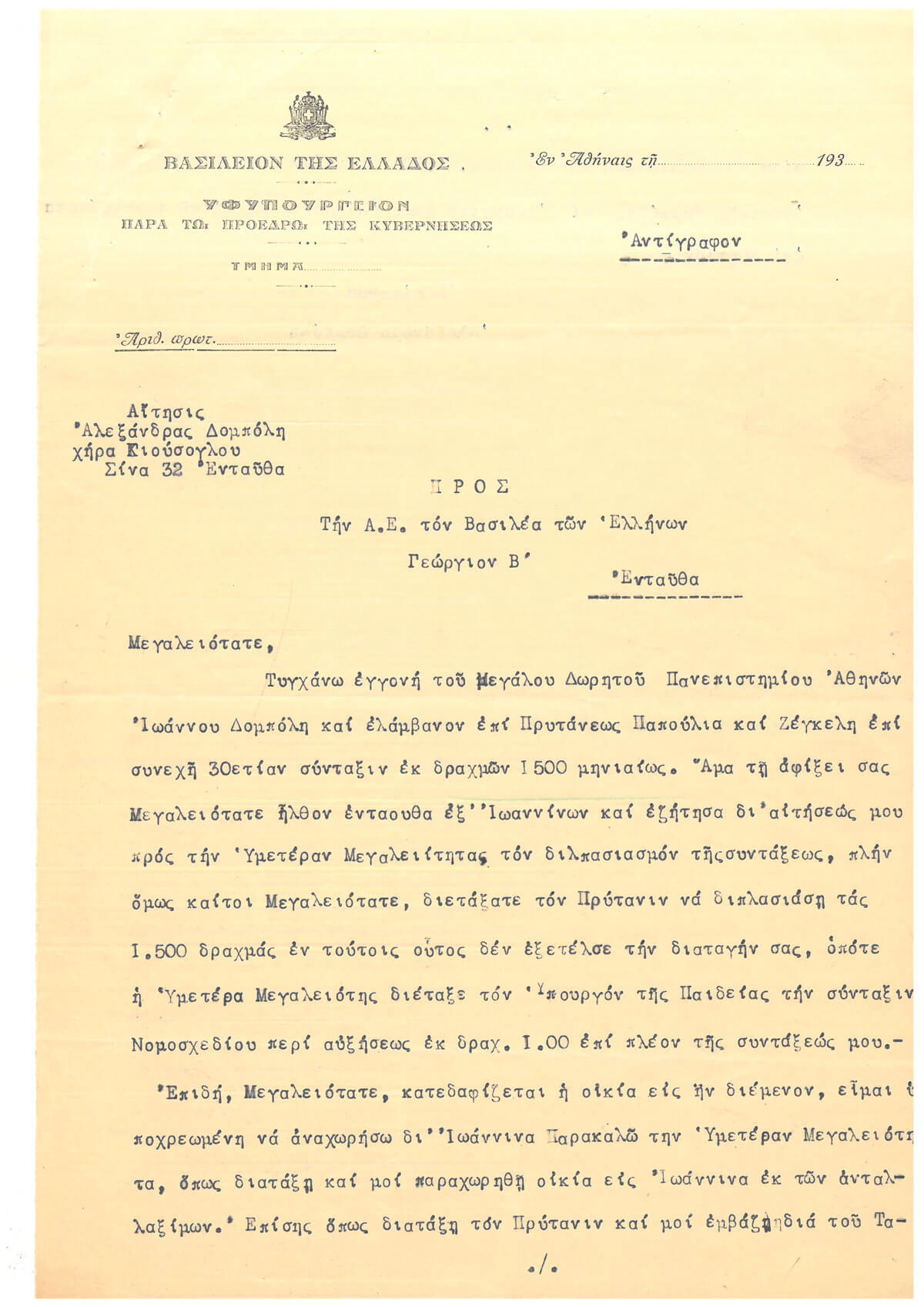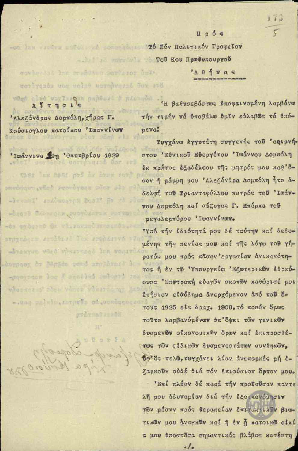 Με τη δεύτερη επιστολή, από της οποίας τη σφραγίδα μπορεί να εξαχθεί το συμπέρασμα ότι τη συνέταξε μέσα στη δεκαετία του 1930, απευθυνόταν στον βασιλιά Γεώργιο Β’ (1890-1947) και ζητούσε την παραχώρηση προσφυγικής κατοικίας εἰς Ἰωάννινα ἐκ τῶν ἀνταλλαξίμων, λόγω της κατεδάφισης της οικίας της. Επιπλέον, τον παρακαλούσε να διατάξει τον Πρύτανη να φροντίζει για την καταβολή της μηνιαίας της σύνταξης.
