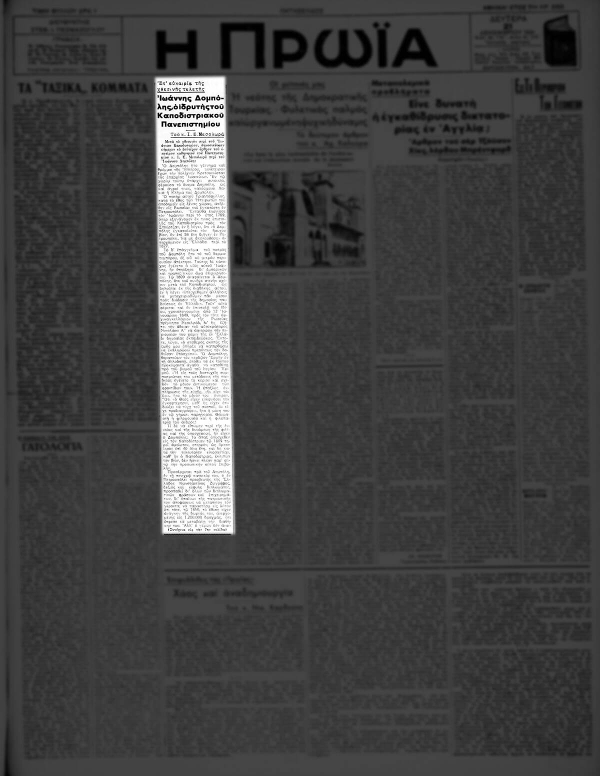 Με αφορμή τα αποκαλυπτήρια του ανδριάντα του Ιωάννη Καποδίστρια στον προαύλιο χώρο του Εθνικού και Καποδιστριακού Πανεπιστημίου Αθηνών, ο ομότιμος καθηγητής της Λειτουργικής και Ομιλητικής στη Θεολογική Σχολή Ιωάννης Ε. Μεσολωράς (1851-1942) έγραψε δύο άρθρα τα οποία δημοσιεύτηκαν, την 20ή και την 21η Δεκεμβρίου 1931, στην Εφημερίδα Η Πρωΐα. Το δεύτερο άρθρο, με τίτλο Ἰωάννης Δομπόλης, ὁ ἱδρυτὴς τοῦ Καποδιστριακοῦ Πανεπιστημίου, αποτελεί εγκώμιο στη ζωή και την πατριωτική δράση του μεγάλου ευεργέτη.