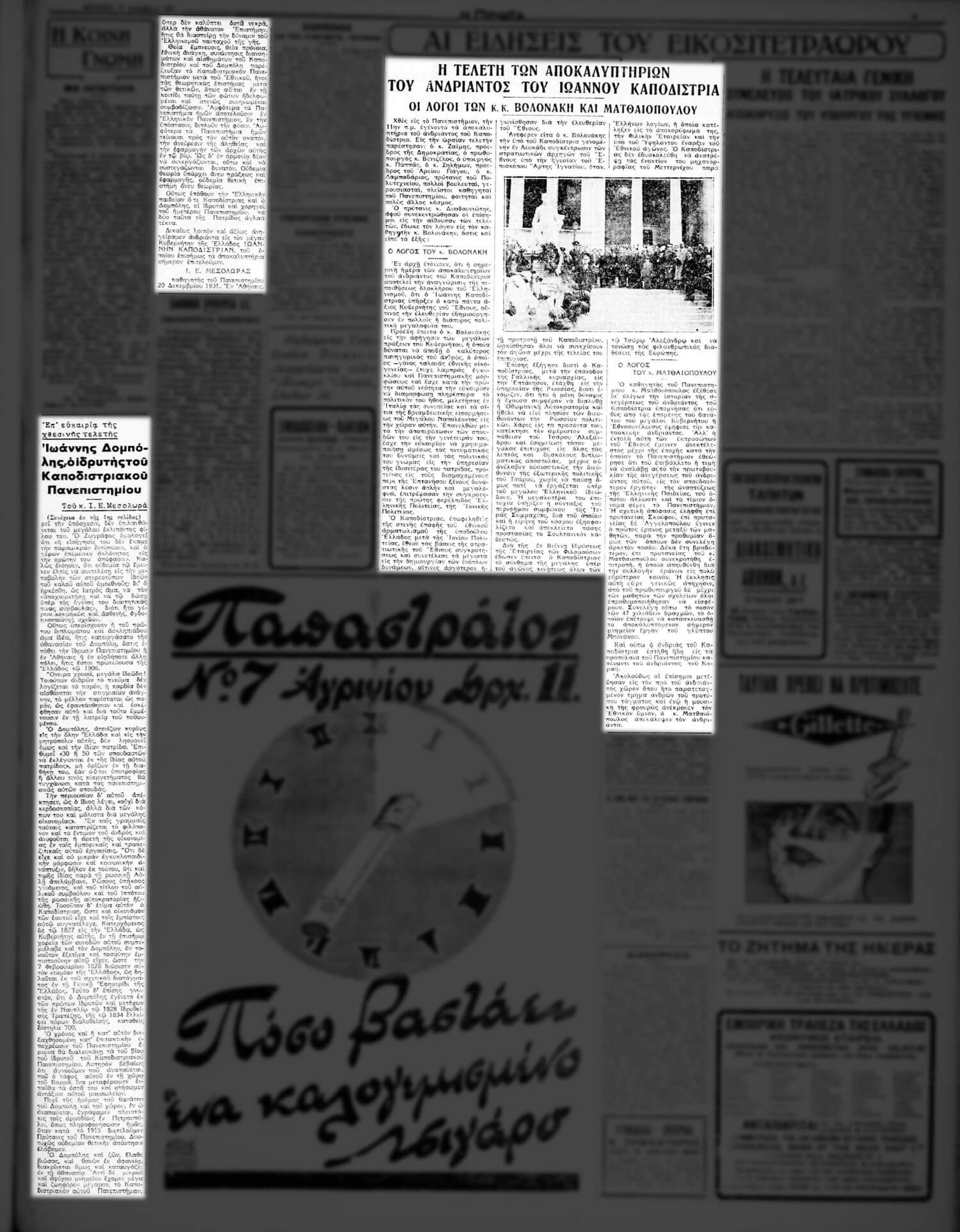 Σε παραπλήσια στήλη της εφημερίδας, δημοσιεύτηκαν οι λόγοι που απήγγειλαν, κατά την τελετή των αποκαλυπτηρίων, ο καθηγητής της Ιστορίας των Μέσων και Νεωτέρων Χρόνων στη Φιλοσοφική Σχολή Μιχαήλ Δ. Βολονάκης (1875-1950) και ο Προπρύτανης και καθηγητής της Οργανικής Χημείας στη Σχολή Θετικών Επιστημών Γεώργιος Θ. Ματθαιόπουλος (1873-1958).