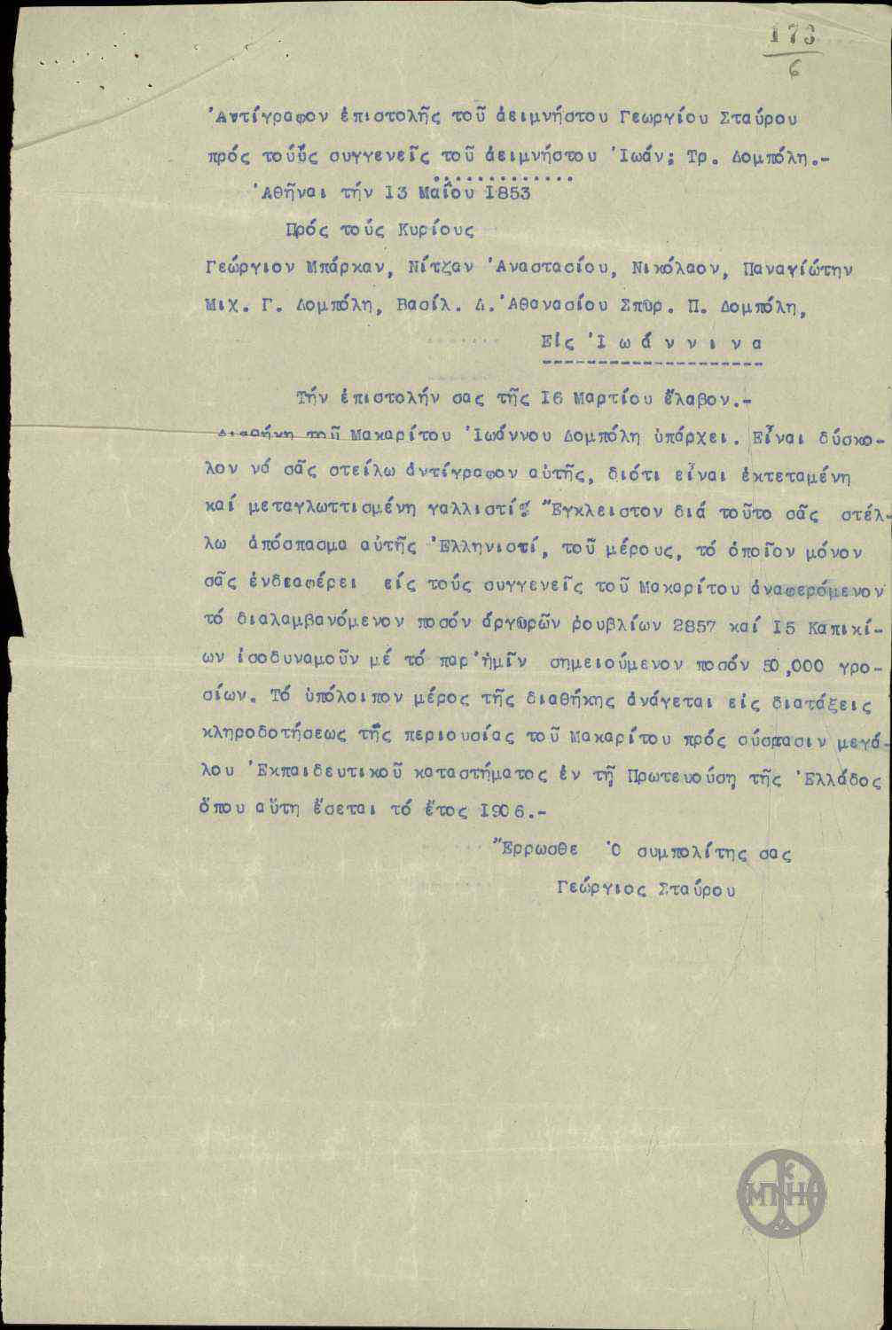Επιστολή του Γεώργιου Σταύρου στους Συγγενείς του Ιωάννη Δομπόλη