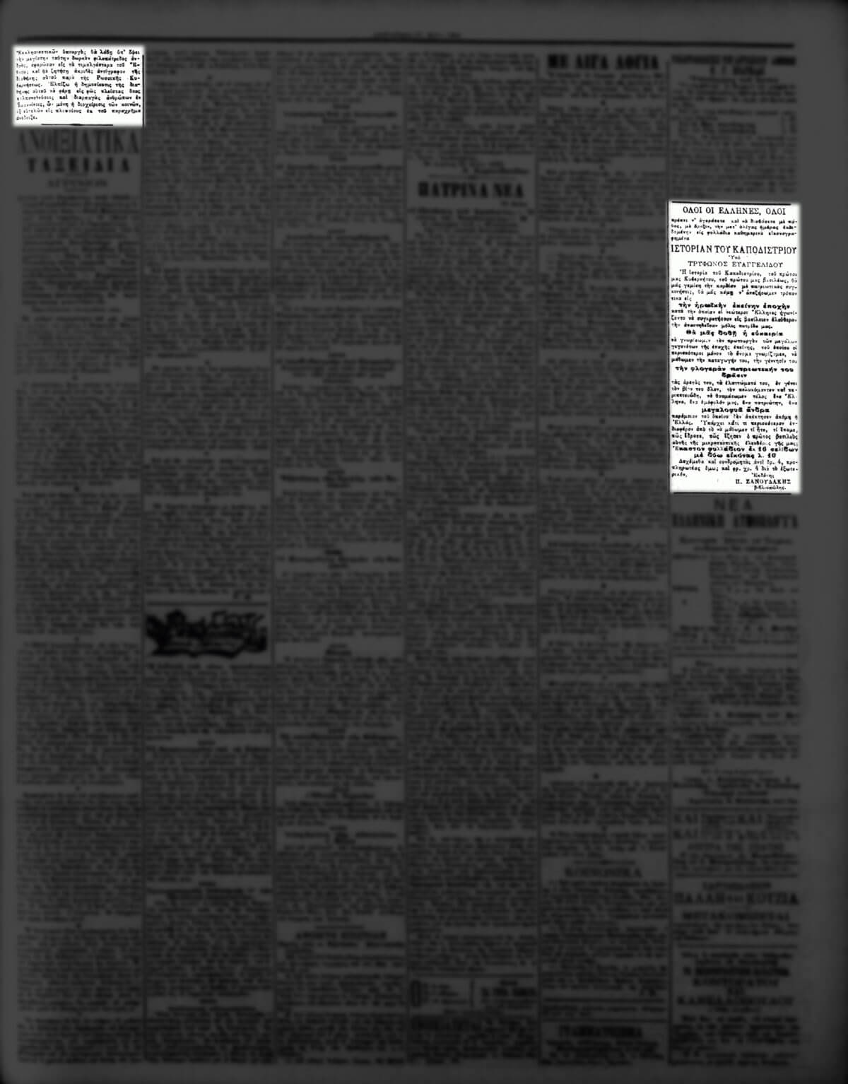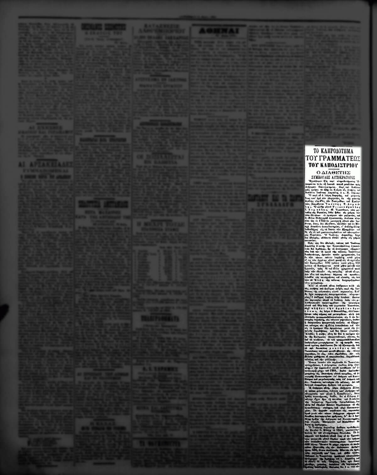 Με το άρθρο Το κληροδότημα του Γραμματέως του Καποδιστρίου, της 30ης Μαΐου 1894, η εφημερίδα Ακρόπολις ενημέρωσε τους αναγνώστες της για την υπόθεση του άγνωστου στο ευρύ κοινό Ιωάννη Δομπόλη και το υπέρογκο ποσό που κληροδότησε για την ίδρυση του Καποδιστριακού Πανεπιστημίου. Ενδιαφέρον παρουσιάζει το ότι σε παραπλήσια στήλη διαφημιζόταν η σειρά εικονογραφημένων περιοδικών του φιλολόγου και συγγραφέα Τρύφωνα Ε. Ευαγγελίδη (1863-1941) με τίτλο Ιστορία του Καποδιστρίου.
