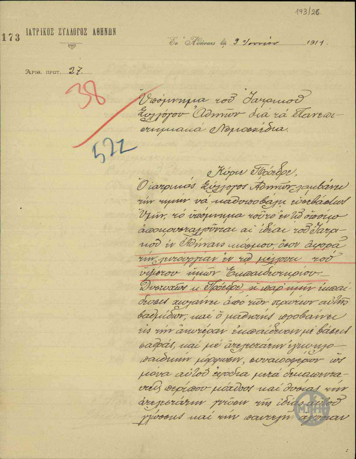 Στις 9 Ιουνίου 1911, ο Ιατρικός Σύλλογος Αθηνών απέστειλε υπόμνημα στον πρωθυπουργό Ελευθέριο Βενιζέλο (1864-1936), με το οποίο εξέφραζε τη γνώμη του σχετικά με το ζήτημα του νέου πανεπιστημιακού νομοσχεδίου.