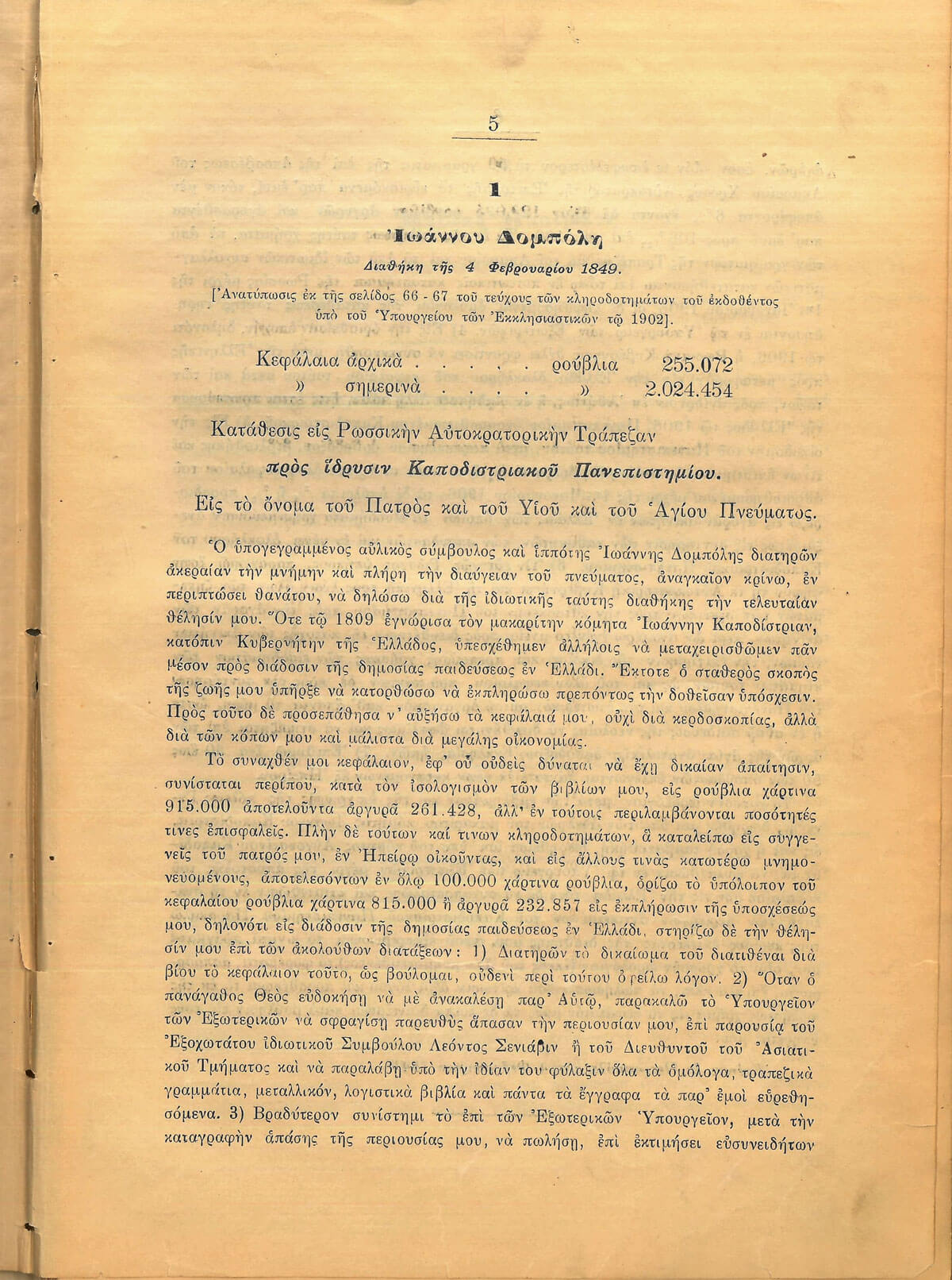 Από τη Διαθήκη Δομπόλη στο Εθνικό και Καποδιστριακό Πανεπιστήμιο Αθηνών