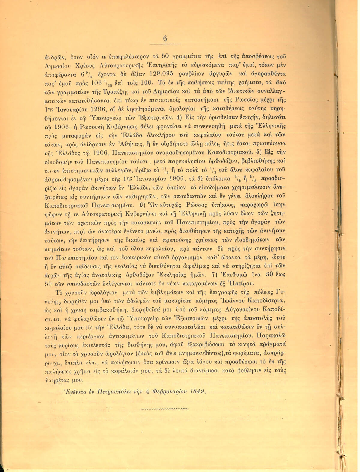 Ο τρίτος όρος της διαθήκης όριζε ότι τα χρήματα θα καταθέτονταν σε ρωσικές τράπεζες, ώστε να σωρευτούν τόκοι, μέχρι την 1η Ιανουαρίου 1906. Τότε, σύμφωνα με τον τέταρτο όρο, η Ρωσική Κυβέρνηση θα έπρεπε να έρθει σε συνεννόηση με την Ελληνική, για τη μεταφορά ολόκληρου του ποσού και των τόκων του στην Ελλάδα. Το κεφάλαιο θα αφιερωνόταν στην ίδρυση, στην Αθήνα ή σε οποιαδήποτε άλλη πόλη ήταν πρωτεύουσα το 1906, Πανεπιστημίου, το οποίο, σε ανάμνηση του εκπαιδευτικού οράματος που μοιράστηκε με τον Κυβερνήτη, θα ονομαζόταν Καποδιστριακό.